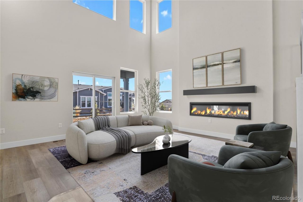 Located in the sought-after Cordera community, this stunning new construction home offers over 3,400 square feet of thoughtfully designed living space with 4 bedrooms and 4 bathrooms. The layout provides a balance of open gathering areas and private spaces, creating a balanced setting for both comfort and hosting guests. The main level features luxury vinyl plank flooring and a spacious great room with an electric fireplace and walk-out access to the backyard. The kitchen blends style and functionality with quartz countertops, a center island, crown moulding, wall oven, gas cooktop, pantry, and a dedicated coffee bar area. A separate dining area provides a more formal space, while the main-level office offers a quiet workspace. A powder bath and mudroom complete the main floor. Upstairs, the primary suite includes a five-piece bath featuring dual sinks, a separate soaker tub, and a walk-in shower, along with a spacious walk-in closet. Two additional bedrooms, a versatile loft area, and convenient upper-level laundry. The finished basement expands the living space with a large family room, an additional bedroom, and a full bath, plus a separate flex/storage area that provides useful space for storage, hobbies, or a home gym. A landscaped yard and 3-car tandem garage complete the home, set within Corderas thoughtfully planned neighborhood with nearby parks, trails, and community gathering spaces.