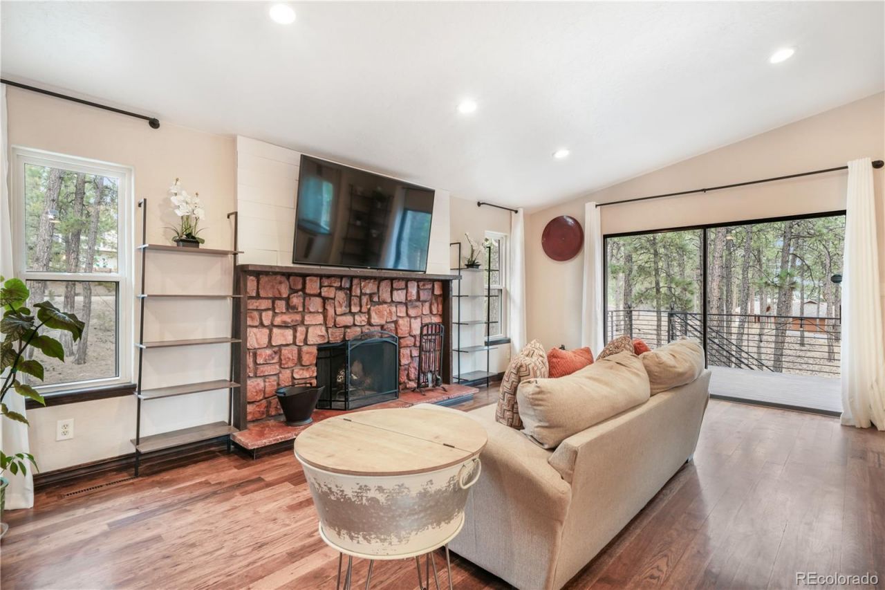 Nestled on nearly half an acre in the trees of Pleasant View Estates, this beautifully maintained corner-lot home offersprivacy, space, and incredible outdoor living. From the moment you arrive, the curb appeal stands out with abundantparking, RV parking, a large exterior shed, & even a charming playhouse tucked among the trees. A 2 car garage andexpansive driveway provide plenty of room for vehicles and guests. This bi-level home features 4 beds, 3 baths with astriking stone and stucco exterior. Inside, the upper level showcases rich wood accents and flooring with an openconcept layout where kitchen and living room flow seamlessly together. The kitchen features stainless steel appliances,gas cooktop, granite countertops, tile flooring, and an eat-in dining area. Step onto the back deck from the kitchen orliving room?perfect for enjoying the peaceful wooded setting. The living room is warm and inviting with a woodburning fireplace featuring a beautiful stone surround. Just off the living area is spacious office with double Frenchdoors, offering flexibility for work-from-home space or potential bedroom and a 3/4 bath. The stunning primary suiteoffers a private balcony, large walk-in closet with custom built-ins, and a spa-like bathroom w/ granite countertops,tiled shower, and built-in sauna. The lower level offers a spacious recreation room w/ a stone surround electric fireplacecreating a great gathering space. Youll also find a laundry room with abundant cabinetry, a utility sink, and includedwasher and dryer. 3 additional bedrooms and a 3/4 bathroom complete the lower level. Walk out to the backyard wherea private hot tub awaits. Conveniently located between I-25 and Highway 83, this property offers easy access to bothDenver and Colorado Springs while still feeling like a private retreat. Shopping, dining, and entertainment are justminutes away. Come experience this unique property and the peaceful setting that makes it truly special.