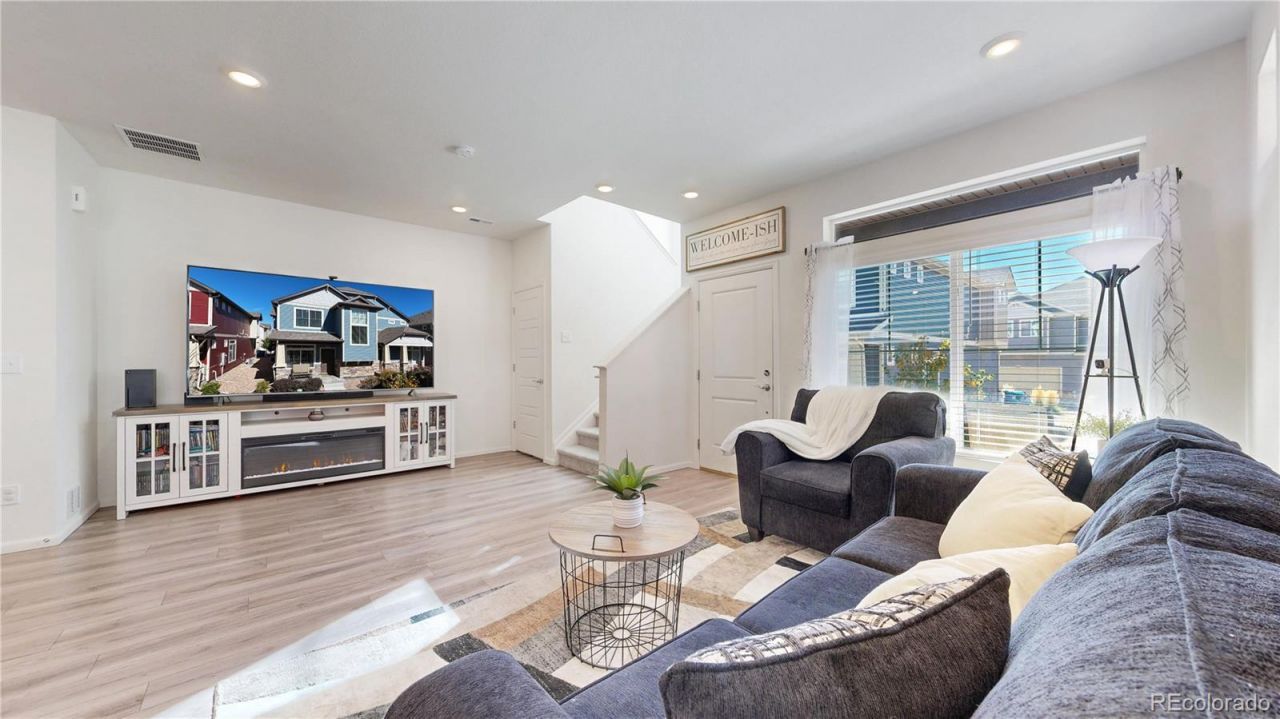 Wow ? a nearly new 3-bedroom paired home with a 2-car garage, a rare loft, and a floorplan that stands out among similar homes in the neighborhood. Inside, the bright and open great-room layout is designed for modern living, with luxury vinyl plank flooring that flows from the spacious living area through the dining space and into the kitchen, anchored by an extended granite island with pendant lighting. Clerestory windows bring in abundant natural light throughout. The kitchen blends style and function with shaker cabinets with pull-out drawers, a subway tile backsplash, stainless appliances, a pantry, and a built-in refrigerator nook?offering both everyday convenience and thoughtful upgrades throughout. The main level also includes a powder bath, access to the attached 2-car garage, and additional storage in closets and the crawl space. Upstairs, the large loft is what truly sets this home apart?offering flexible space for a home office, second living area, or playroom, and easily converted into a fourth bedroom. A layout like this offers more usable living space than similar paired homes currently available in the area. The primary suite features a walk-in closet and an ensuite bath with a granite double vanity and tiled walk-in shower. Two additional bedrooms, a full bath, and a convenient laundry room complete the upper level. Reunion offers one of the most amenity-rich lifestyles in the area, including two resort-style pools with slides, a recreation center with gym and basketball courts, over 150 acres of parks and trails, and tennis and pickleball courts. Enjoy a charming front porch, a low-maintenance xeriscaped yard, and a location that puts you just 15 minutes from DIA, 10 minutes to Buffalo Run Golf Course, 15 minutes to Prairie Center shopping, and about 25 minutes to downtown Denver.