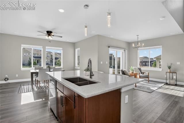Step into this home in the desirable Wagons West community, where an open-concept main level seamlessly connects the kitchen, dining, and family areas—perfect for entertaining. The kitchen features stainless steel appliances with an upgraded Bosch 800 dishwasher and an island with barstool seating. The family room is enhanced with built-in Klipsch Pro RC surround sound. Light-filled spaces are complemented by LVP flooring on the main level, upgraded carpet padding, and faux wood blinds throughout. The primary suite offers blackout shades, Closets by Design upgrades, a dual-sink vanity, and a free-standing shower. Additional features of this home include a central vacuum, Rheem tankless water heater, and an HVAC system with a whole-house humidifier and electrostatic air filter. The garage provides four overhead storage racks with Safe Racks. Outdoors, a Jacuzzi hot tub conveys with the property for ultimate relaxation overlooking the fully fenced backyard & open space behind the property. With scenic views of Mt. Herman and the Front Range, residents enjoy easy access to the Santa Fe Trail, downtown Monument, Jackson Creek shopping, and I-25, blending convenience with natural beauty.