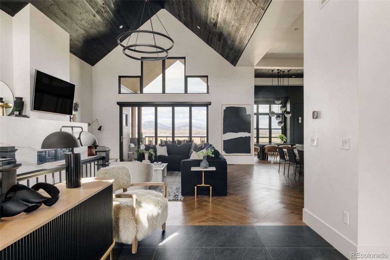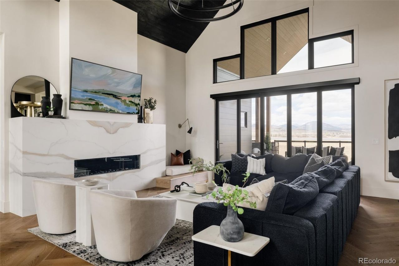 Award-winning Modern Mountain home?featured on HGTVs Rock the Block?on a quiet cul-de-sac in the gated Rookery at Heron Lakes. The home makes a statement with soaring 5 beetle-kill pine vaulted ceilings, herringbone hardwood floors, a sleek linear gas fireplace & a striking RH chandelier. Motorized blinds & expansive windows flood the open-concept main level with light while framing serene views. The chefs kitchen is a true centerpiece, blending design & performance with porcelain & quartz countertops, dark Emtek hardware with inset pulls, a 60 Ilve dual-oven gas range, Dacor refrigerator, freezer, dishwasher, built-in steam oven & a boutique-style pantry concealed behind rounded solid wood doors. Seamless indoor-outdoor living unfolds through expansive accordion doors opening to a covered deck with sweeping views of Lone Tree Reservoir, the Rookery & the Rocky Mountains?an exceptional setting for both quiet mornings & sunset entertaining. The main level hosts three ensuite bedrooms, including a luxurious primary retreat with radiant heated bathroom floors, a boutique custom closet & private laundry?one of three laundry areas throughout. A designer ombré bedroom adds a distinctive, curated touch. The walk-out lower level is designed for entertaining with a full second kitchen (Ilve range, Dacor appliances), a theater room with cork walls, tiered seating & custom lighting & a climate-controlled gym with overhead door access. Outdoor spaces rival a private resort with custom landscaping, locally sourced boulders, a water feature, private basketball court, putting green & turf yard with integrated drainage. The oversized garage features epoxy floors, built-in storage & a 240V EV outlet. Enjoy TPC golf privileges & access to resort-style amenities with an annual membership fee to the clubhouse, pool, fitness center, trails, dining & over 130 acres of open space?an elevated lifestyle within one of Northern Colorados most exclusive gated communities.