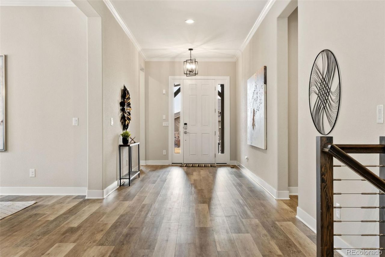 Welcome to 27620 Lakeview Drive ? a thoughtfully upgraded 6 bedroom, 5 bathroom home in Southshore with a layout designed for comfortable living and easy entertaining. Two front bedrooms greet you as you enter, one framing a peaceful lake view youll never get tired of. A formal dining room flows into the kitchen through a spacious butlers pantry, making entertaining feel effortless. The kitchen delivers ? quartz countertops, tile backsplash, gas cooktop, wall oven and microwave, a large center island, breakfast nook and an oversized walk-in pantry. The bright living room with a gas fireplace sits just off the kitchen. The main level includes a home office with a half bath and the primary suite. The primary suite is a genuine retreat with plantation shutters, an upgraded five-piece bath featuring a walk-in shower with built-in seat and freestanding soaking tub, and a custom California Closet system that connects directly to the laundry room ? because someone who does laundry every day designed this house. The basement alone is worth the visit ? large second living room, three bedrooms with egress windows, two with walk-in closets, a ¾ bath with double sinks, wet bar, home theater area with its own half bath, and a flex space for a gym or office. Brand new carpeting has been installed throughout. Other features: whole-house humidifier, whole-house fan, tankless water heater, reverse osmosis system, water softener, extended three-car garage with EV charger and owned solar panels paid off at closing. The kayaks and bikes stay ? and with Aurora Reservoir just across the street, youll put them to good use. Step outside to a lake view front patio, covered back patio with automatic blinds, xeriscaped yard with artificial turf, raised garden beds with drip irrigation, and jelly lights front and back. Southshore is a community that earns its reputation ? two pools, two community centers, and two fitness centers. Oh, and the sellers are covering your first year of HOA dues!