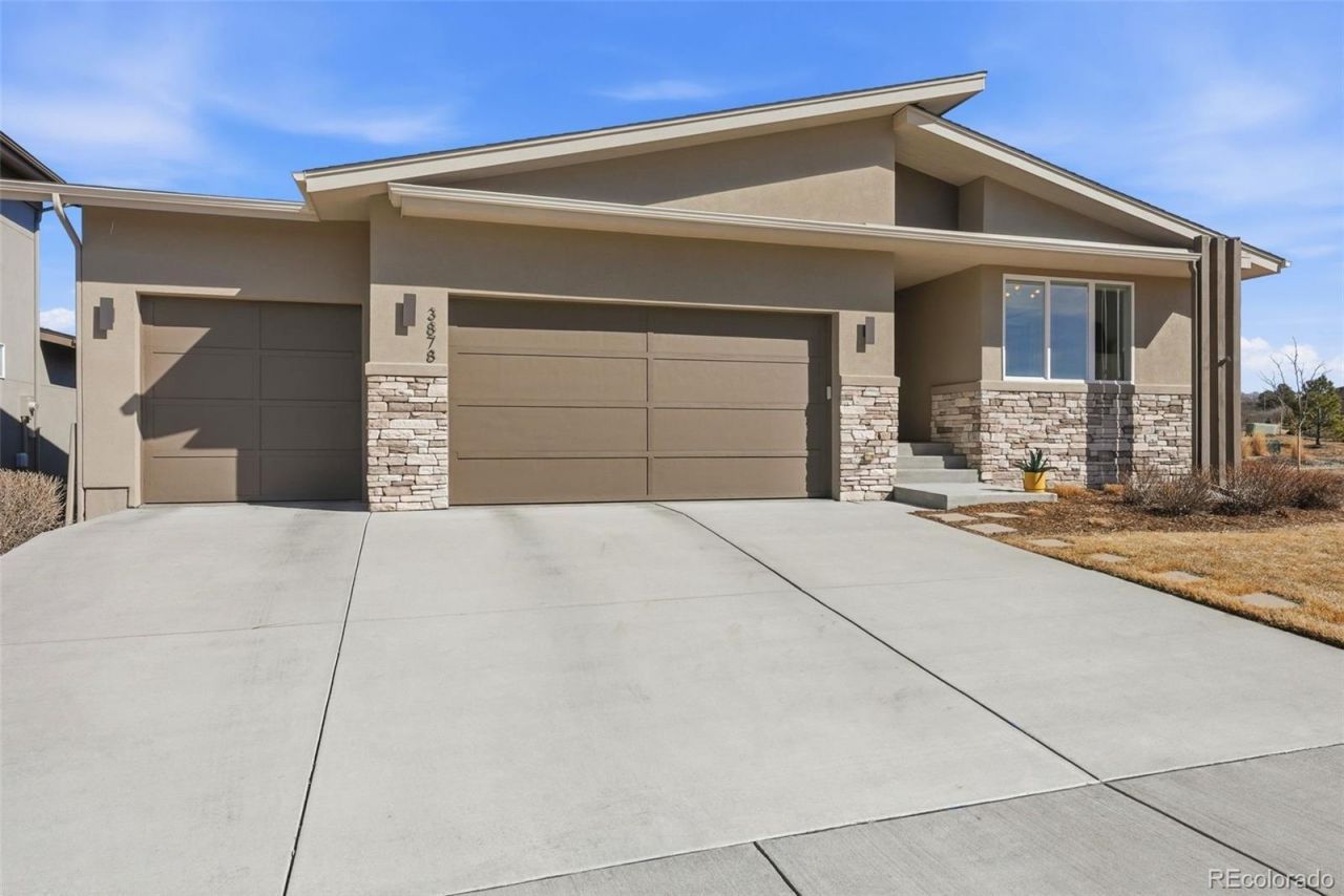 Ranch style - 4 car garage - D20 - No Metro District - 4 beds + office + exercise room + no yard maintenance. Dont miss this modern and pristinely maintained rhome in Corderas lock-and-leave Elan community. The elevated style and finishes are evident from the moment you walk in with a 10 entry that directly leads to the open family room, kitchen, and dining area. The linear gas fireplace is a feature of the great room and the chefs kitchen boasts a large island, walnut cabinets, neutral quartz countertops, a cafe-style two-oven gas stove, ample counter space with separate baking nook, and a spacious pantry. The den sits immediately off the great room, providing a family room, office/work space, or playroom adjacent to the hub of the home. The primary suite sits privately at the back of the home and the primary bath features a long vanity, great natural light, and a spacious tiled shower. The main floor also features a second bedroom and bathroom with tub, a dedicated laundry room, a separate mudroom that leads to the garage, plus a private back porch with a hot tub and plenty of space to entertain. The basement offers upgraded high ceilings, a spacious recreational area/family room, two additional bedrooms, a large hall bath with two sinks, plus a bonus room currently used as a workout room. The basement also features a convenient unfinished storage space. This home sits high in a quiet cul de sac and features amazing views of Pikes Peak from the front bedroom and drive-way. The windows of the home face open areas and the vast Cordera trail system which provides access to the highly sought-after master planned community including a clubhouse with two pools, a workout room, meeting spaces, and featured community events. The home sits conveniently across from the neighborhood mailboxes and is nearby Pine Creek High School (D-20). On top of myriad community features, HOA for Elan includes snow driveway/walkway snow removal plus yard maintenance and watering.