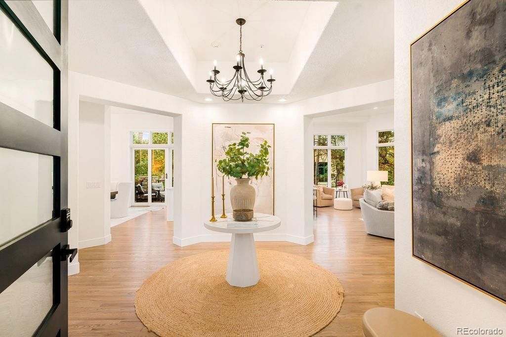 Welcome to Silver Cliff Court, a thoughtfully renovated home tucked inside Castle Pines Village. From the moment you step inside, youll notice the natural light, open layout, and elevated design choices that set this home apart. The main-level primary suite offers everyday ease, while the reimagined kitchen features dual peninsulas, expansive counter space, and an open-concept flow thats ideal for gathering. Tasteful upgrades fill the home from designer light fixtures, custom motorized shades, and built-in shelving.The main living spaces are light-filled and airy, with 14-foot ceilings and expansive 10-foot windows that frame views of the surrounding trees. Step outside onto the deck off the dining area, where mature aspens and pines?intentionally added for extra privacy?create a peaceful backdrop for morning coffee or evening wind-downs.The finished walkout basement adds even more versatility, with three additional bedrooms, two three-quarter bathrooms, a cozy fireplace, a wet bar, wine storage, and a generous family room perfect for movie nights, game days, or extended guest stays. Every detail has been curated with care, offering a rare opportunity to enjoy an updated, move-in-ready home in one of Castle Rocks most desirable communities.The Village at Castle Pines offers 24/7 security and on-site emergency services. Residents enjoy extensive amenities including three pools, a fitness center, tennis and pickleball courts, parks, and miles of walking and biking trails. The community also features two private Jack Nicklaus-designed golf courses ? The Country Club at Castle Pines and Castle Pines Golf Club ? plus easy access to Denver, DTC, and Colorado Springs via I-25.
