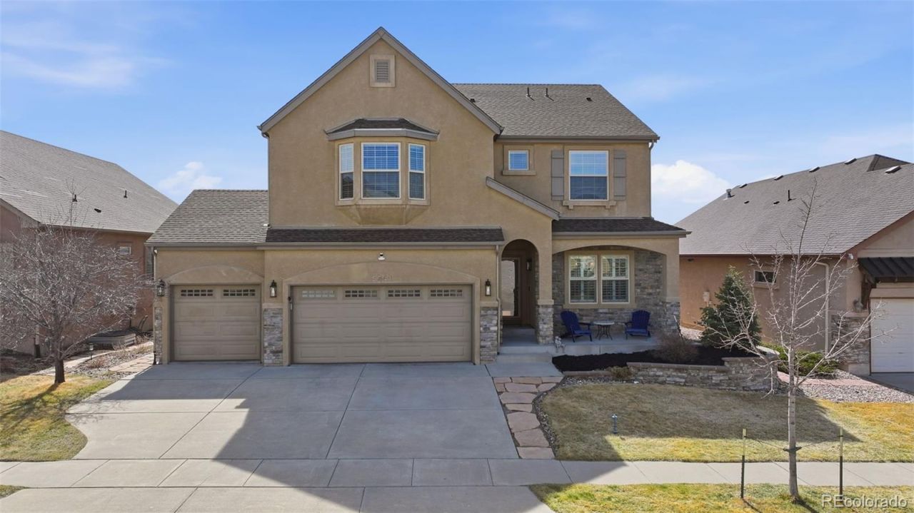 Located in the Wolf Ranch master-planned community within the award-winning Academy School District 20 and walking distance to the neighborhood elementary school, parks, and scenic trails. Spacious turnkey two-story home with a fully finished basement offering comfort, style, and modern functionality with Pikes Peak and Front Range mountain views. Main level features an open floor plan with natural hardwood floors, formal dining room, and bright great room with soaring ceilings and fireplace. Remodeled kitchen in May 2025 includes quartz countertops, farmhouse sink, new backsplash, stainless steel appliances, large center island, abundant cabinetry, and Butlers Pantry with visibility throughout the main living area. Upstairs loft provides additional living space ideal for office, media room, or second family room. Primary suite features a two-sided fireplace separating the bedroom and spa-style bath with dual vanities, soaking tub, spacious shower, and large walk-in closet. New flooring extends through the primary suite, hallway, and loft. Finished basement includes bedroom, large family or recreation room, and wet bar ideal for guests, multi-generational living, or entertainment. Recent upgrades include fresh interior paint, new carpet, updated lighting, new ceiling fixtures throughout, and new living room ceiling fan. Smart home features include Ecobee thermostat and Vivint security system with cameras, exterior lighting, window and door sensors, and intercom communication to the front door and yard areas. Covered rear deck with outdoor TV overlooks the landscaped backyard and mountain views. Located minutes from the Wolf Ranch Recreation Center, pool, shopping, dining, and convenient access to Powers Boulevard and I-25. Walking distance to Wolf Ranch community events including summer concerts and fall pumpkin patch festival. Move-in ready and ideally located to enjoy the lifestyle, amenities, and community events that make this such a desirable neighborhood.