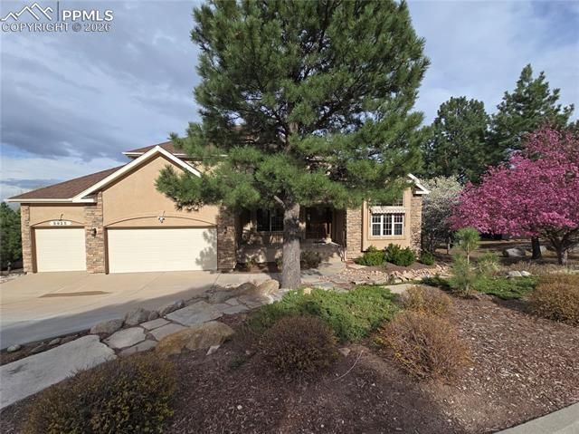Nestled in the sought-after Spires neighborhood at the base of Cheyenne Mountain, this exceptional home blends elegance, comfort, and natural beauty. Set on a beautifully landscaped lot with mature trees, it offers breathtaking mountain views and inviting outdoor living spaces. The main level is an open, light-filled floor plan designed for both everyday living and refined entertaining. Just off the grand entry, a formal dining room showcases classic crown molding, while a versatile living room or study features a vaulted ceiling, fireplace, and stunning views. The impressive two-story great room is the heart of the home, highlighted by soaring ceilings, a dramatic wall of windows, and a cozy fireplace. The chef’s kitchen is well-appointed with a center island, granite countertops, Samsung smart refrigerator, Bosch dishwasher, and JennAir gas cooktop. The adjoining hearth room, with a two-sided fireplace, flows seamlessly into the breakfast nook and out to an expansive deck with an automatic retractable awning and sunshade—perfect for enjoying the flat, usable backyard.The main-level primary suite is a private retreat featuring a two-sided fireplace, luxurious five-piece bath with jetted tub, and a walk-in closet with built-ins. Upstairs, a second primary suite provides added privacy, while two additional bedrooms share a Jack-and-Jill bath.The walk-out basement offers exceptional flexibility with a spacious recreation room, wet bar with dishwasher, and access to a covered, fenced patio with artificial turf—ideal for pets or play. Two additional basement rooms can serve as bedrooms, a gym, or game rooms. Recent upgrades include: fully rebuilt covered deck with drainage system, fireproof ceiling below on the covered patio with overhead lighting, new railing on deck, driveway concrete repair for easy drive access, stucco repaired and added all around the house, all gutters, downspouts and trim painted. Interior painted. electric shade and awning on rear of home.